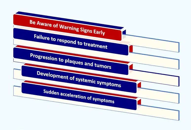 - Progression to plaques and tumors: The development of thicker, raised lesions (plaques) or lumps/nodules (tumors) that can ulcerate is a sign of advancing CTCL not typically seen in standard eczema.